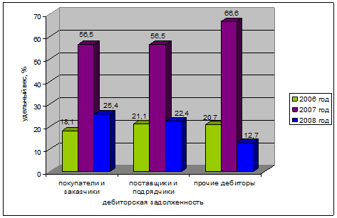 Покупатели и заказчики в течение трех лет изменяются не равномерно, в 2006 году они составляют 18,1%, в 2007 году – 21,1% и в 2008 году – 20,7%. Прочие дебиторы с каждым годом сокращаются и в 2006 году равняются 229 131 тыс. руб., в 2007 году 190 822 тыс. руб., в 20008 году – 76 057 тыс. руб. Это говорит о постепенном снижение долгов сторонних организаций перед предприятием, правильной политики предприятия в выборе партнеров, нормальными объемами темпов продаж и реализации услуг.