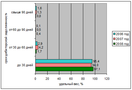 Данные таблицы 6 свидетельствуют о том, что давность дебиторской задолженности не превышают одного месяца со дня отгрузки товара и в 2006 году составляет 97,1%, в 2007 году – 94,0% и в 2008 году – 95,4. Однако, следует обратить внимание на то, что существует задолженность, по которой срок погашения превышает 90 дней и более, к тому же в 2008 году она увеличивается до 1,6% (рисунок 7). Работа с данными организациями-должниками должна быть белее тщательной. Одним из вариантов по взиманию долг может быть обращение в хозяйственный суд.