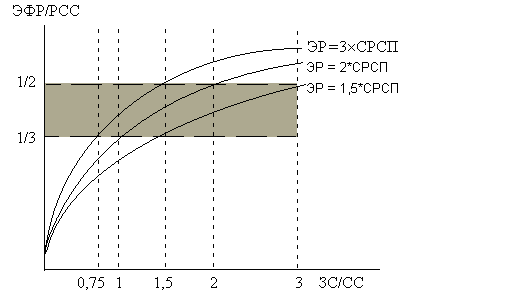 3. Следует заметить, что имеются оптимальные значения для ЭФР и плеча рычага. Такое значение ЭФР находится на рис. 5 между величинами 1/2 и 1/3 РСС (цифра получена на основании изучения эмпирического материала по хорошо работающим корпорациям Запада).