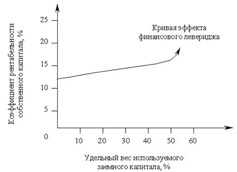Кроме того, снижение финансовой устойчивости предприятия в процессе повышения доли используемого заемного капитала приводит к увеличению риска его банкротства, что вынуждает кредиторов увеличивать уровень ставки процента за кредит с учетом включения в нее премии за дополнительный финансовый риск. При определенном уровне этого риска (а, соответственно, и уровне общей ставки процента за кредит) дифференциал финансового левериджа может быть сведен к нулю (при котором использование заемного капитала не даст прироста рентабельности собственного капитала) и даже иметь отрицательную величину (при которой рентабельность собственного капитала снизится, так как часть чистой прибыли, генерируемой собственным капиталом, будет уходить на формирование используемого заемного капитала по высоким ставкам процента).