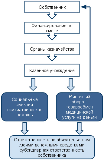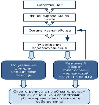 Учреждения здравоохранения решают социальную функцию оказания медицинской помощи целевой группе в рамках сметного финансирования, а с разрешения органа управления здравоохранения занимаются медицинским бизнесом (оказанием платных медицинских услуг) в рамках товарообмена медицинских услуг на денежные средства с зачислением их на лицевые счета органов Федерального казначейства.