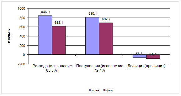 В 2007 году Поступления в государственный бюджет составили 613,1 млрд. тенге, или 72,4 % к плану, расходы произведены на сумму 692,7 млрд. тенге, или 85,5 % к плану. При запланированном дефиците – 56,3 млрд. тенге, фактически дефицит сложился 84,7 млрд. тенге (рисунок 4).