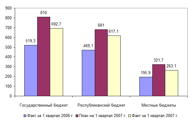 На диаграмме рисунка 3 видно, что темпы роста государственного в том числе местных бюджетов по сравнению с 1 кварталом 2006 года соответственно составили 106,0 %, 131,6%, а по республиканскому бюджету произошло снижение, поскольку в 1 квартале прошлого года перечисления поступлений от нефтяного сектора в Нацфонд осуществлялись через бюджет.