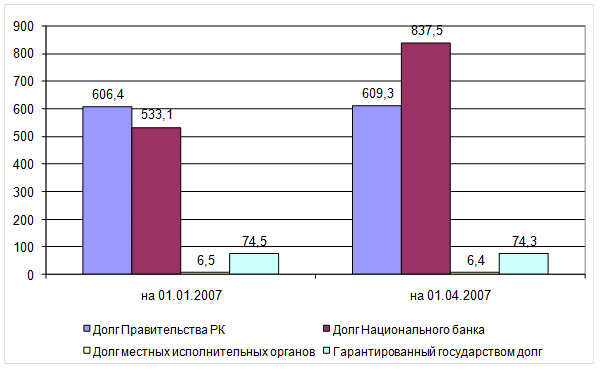 Государственный долг Республики Казахстан (без учета взаимных требований) на 1 апреля 2007 года составил 1 453,1 млрд. тенге. В портфеле правительственного долга соотношение внутреннего и внешнего долгов составляет 65,4 и 34,6 %, соответственно. За отчетный период было осуществлено досрочное погашение наиболее дорогих в обслуживании займов МББР в размере 13,5 млрд.тенге (или 107,6 млн. долл. США). Слайд 9.