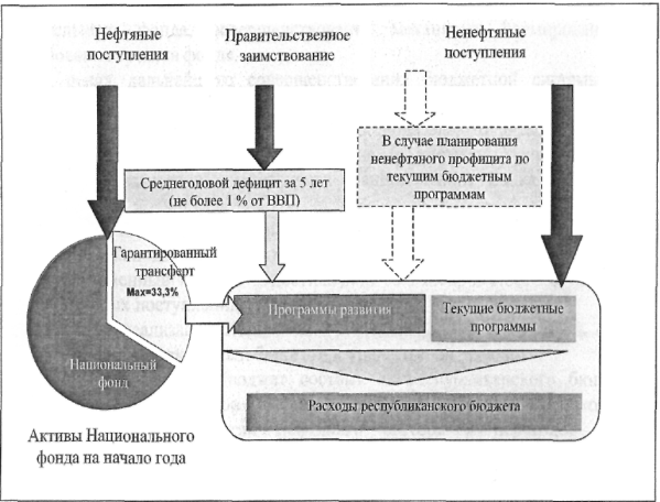 Расходы республиканского бюджета на текущие бюджетные программы будут финансироваться за счет отчислений в республиканский бюджет от не нефтяной части экономики, а финансирование расходов на бюджетные программы развития осуществляться за счет гарантированного трансферта из Национального фонда. При этом, определенная доля расходной части бюджета может покрываться, в том числе за счет заимствования в рамках установленных ограничений.