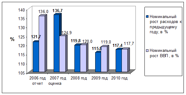 В 2008 – 2010 годах темпы роста государственных расходов предполагаются ниже темпов номинального роста ВВП и составят в среднем 17,6 % и 19,0 % соответственно.
