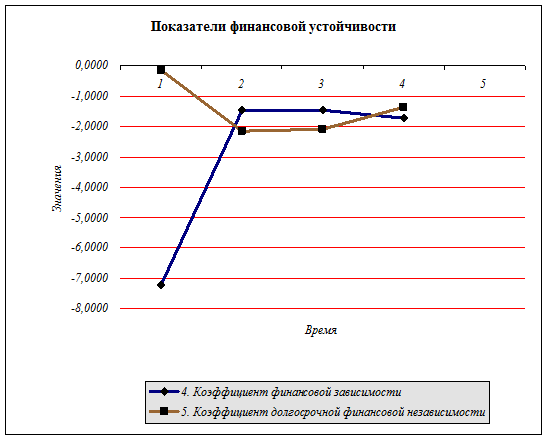 4. Коэффициент финансовой зависимости много ниже нуля во всех периодах, что говорит о том сколько заемных средств привлекло предприятия на 1 руб. собственного капитала. Оптимальное значение ниже 0,7, но так как этот коэффициент отрицательный это тоже отрицательное явление.