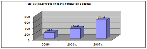 Как видно из диаграммы 3.1. доход от сдачи в аренду помещений растет из года в год. Также растет и доля доходов от аренды в общей структуре доходов от предпринимательской деятельности с 27,12 % в 2005 году до 60,54 % в 2007 году.