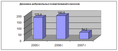 Как показывает диаграмма 3, динамика добровольных пожертвований и взносов к 2005 году становится отрицательной. Также снижается и доля в структуре доходов с 23,44 % в 2005 году до 5,2 % в 2007 году. Этот факт свидетельствует о снижении интереса потенциальных инвесторов и благотворительных организаций к профессиональному образованию.