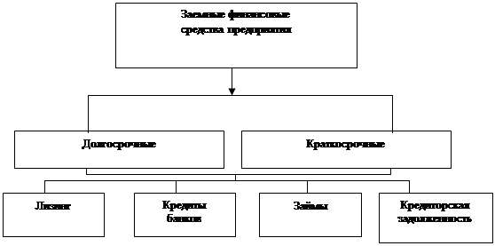 Заемный финансовые средства предприятия (рис.1.2) - это кредиты банков и финансовых компаний, займы, кредиторская задолженность, лизинг, коммерческие бумаги и др., иначе это называется еще заемным капиталом предприятия. Он подразделяется на долгосрочный (более года) и краткосрочный (до года).