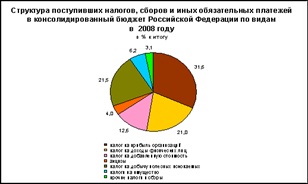 В 2008г. в консолидированный бюджет Российской Федерации поступило федеральных налогов и сборов 7265,3 млрд.рублей (91,5% от общей суммы налоговых доходов), региональных - 403,5 млрд.рублей (5,1%), местных налогов и сборов - 90,7 млрд.рублей (1,1%), налогов со специальным налоговым режимом - 184,7 млрд.рублей (2,3%) [12].