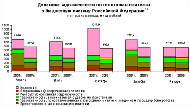 Однако в России существуют проблемы, связанные с просроченной налоговой задолженностью. По оперативным данным Федеральной налоговой службы, задолженность по налогам и сборам, учитываемая с момента ее возникновения(без учета задолженности по уплате пеней и налоговых санкций),в бюджетную систему Российской Федерации на 1 января 2009г. составила 559,1 млрд.рублей. По сравнению с 1 января 2008г. она сократилась на 2,8%, в том числе по налогу на добычу полезных ископаемых - на 18,1%, на добавленную стоимость - на 2,7%, акцизам в целом - на 3,3%, из нее на вина - 65,0%, дизельное топливо - на 60,1%, табачную продукцию - на 33,2%, легковые автомобили и мотоциклы - на 12,2%, пиво - на 8,1%, автомобильный бензин - на 3,7%. Увеличилась задолженность по акцизам на спирт этиловый из всех видов сырья (в том числе этиловый спирт сырец из всех видов сырья) - на 41,5%, алкогольную продукцию с объемной долей этилового спирта свыше 25% включительно (за исключением вин) - на 21,9%, налогу на прибыль организаций - на 4,9% [12]
