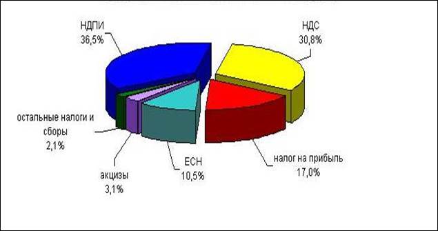 В настоящее время действует 10 федеральных налогов. Основные федеральные налоги: НДС, акцизы, таможенная пошлина, налог на прибыль предприятий и организаций, налог добычу полезных ископаемых, ЕСН (см. рис.2).
