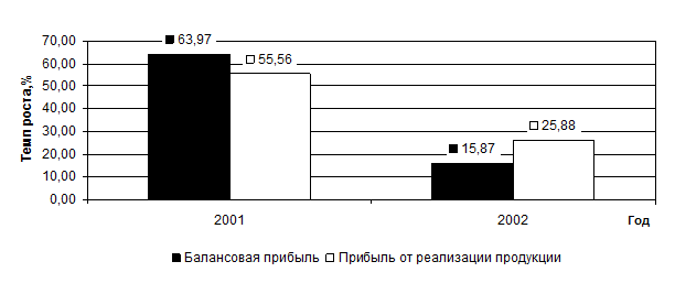 Если в 2002 году темп роста прибыли от реализации продукции и темп балансовой прибыли свидетельствуют о спаде в работе предприятия, то эти показатели за 2003 год показывают катастрофическое положение. Причем, в 2002 году темп роста балансовой прибыли оказывается выше темпа роста прибыли от реализации продукции, 63,97 % и 55,56 % соответственно. Это связано со значительным уменьшением себестоимости с 5389,1 тыс. руб. в 2001 году до 3793,2 тыс. руб. в 2002 году. В 2003 году темп роста прибыли от реализации продукции выше темпа роста балансовой прибыли, 25,88 % и 15,87 % соответственно.