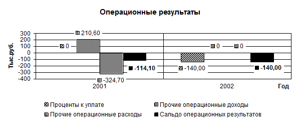 На рисунке 2.3 показано влияние и состав операционных результатов на балансовую прибыль предприятия. Данные за 2001 год опущены, так как операционные результаты и их составляющие были равны нулю. В 2002 году прочие операционные доходы составили 210,6 тыс. рублей, прочие операционные расходы составили 324,7 тыс. рублей. Проценты к уплате равны нулю. Сальдо операционных результатов получилось отрицательным и равно -114,1 тыс. рублей. За 2003 год наоборот, прочие операционные доходы и расходы равны нулю, а проценты к уплате составили 140 тыс. рублей. Отсюда и сальдо операционных результатов за 2003 год равно процентам к уплате и составляют -140 тыс. рублей.