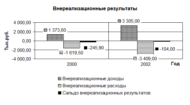 На рисунке 2.4 показано влияние и состав внереализационных результатов на балансовую прибыль предприятия. Данные за 2002 год опущены, так как внереализационные результаты и их составляющие были равны нулю. В 2001 году внереализационные доходы составили 1373,6 тыс. рублей. Внереализационные расходы в 2001 году получились гораздо больше – 1619,5 тыс. рублей, отсюда и отрицательное сальдо внереализационных результатов 2001года, которое равно минус 245,9 тыс. рублей. В 2003 году возросли как внереализационные доходы, так и внереализационные расходы. Внереализационные доходы 2003 года составили 3305 тыс. рублей, а внереализационные расходы равнялись 3409 тыс. рублей. Отсюда и сальдо внереализационных результатов за 2003 год, которое составило минус 104 тыс. рублей.