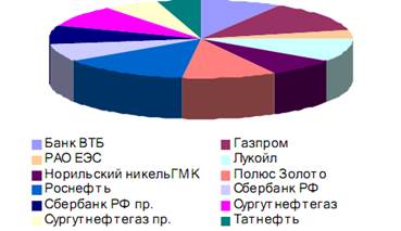 Например в портфель включаем высоколиквидные российские акции, лидеры по среднедневному обороту на ММВБ за последние полгода. На 1.10.09.- это 13 наиболее ликвидных акций, представляющих разные отрасли российской экономики: