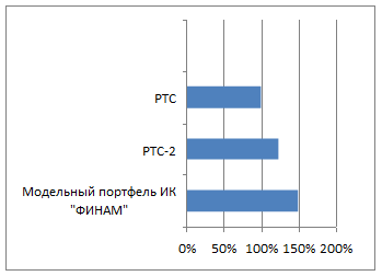 Рассмотрим портфель агрессивного инвестора на примере модельного портфеля ИК «ФИНАМ». С начала года модельный портфель зафиксировал 150 %-ный прирост, значительно опередив индекс РТС (+99%) и превзойдя индекс РТС -2(+122%). Динамика индексов представлена на рис. 6.