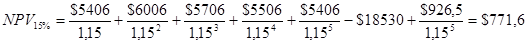 На основании изучения рынка продукции, которая производится на предприятии, установлена возможность увеличения платежеспособного спроса на неё. В связи с этим предприятие рассматривает целесообразность приобретения новой технологической линии для увеличения производства продукции с целью увеличения объема продаж. Оценка возможного увеличения объёма продаж установлена на основании анализа данных о потенциальных возможностях конкурентов. Стоимость линии (капитальные вложения по проекту) составляет $18530; срок эксплуатации - 5 лет; прибыль за вычетом налога на нее от реализации основных фондов по истечении срока их службы составит $926.5;. денежные потоки (прибыль за вычетом налога на нее и амортизационных отчислений от стоимости введенных в действие основных фондов за счет капитальных вложений) прогнозируется по годам в следующих объемах: $5406, $6006, $5706, $5506, $5406. Ставка дисконта для определения теперешней стоимости денежных потоков принята в размере 12% и 15%. Граничная ставка для оценки расчетного уровня внутренней ставки дохода установлена в размере 16%. Приемлемый для предприятия период окупаемости капитальных вложений, исчисленный по данным о денежных потоках и теперешней стоимости денежных потоков принят 5 лет. Целесообразен ли данный проект к реализации?