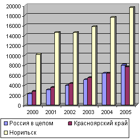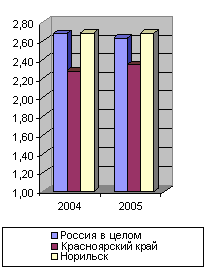 На протяжении последних пяти лет средний уровень доходов населения Норильска существенно превышал как среднероссийский, так и красноярский. В 2005 году это превышение составляло примерно 2,5 раза (рис. 4.). Надо учитывать, однако, существенно более высокую стоимость жизни в городе, связанную с его изолированностью и тяжелыми природно-климатическими условиями. Прожиточный минимум для Норильска превышает средний уровень по России в целом и по Красноярскому краю соответственно в 2,4 и 2,25 раза. Если измерять уровень благосостояния населения в единицах регионального бюджета-минимума, то Норильск находится на среднероссийском уровне и пока еще незначительно превышает уровень Красноярского края (рис. 5).
