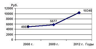 среднедушевые доходы населения в 2012 году - 10 345 рублей, рост в 2 раза к уровню 2008 года (рис. 3):