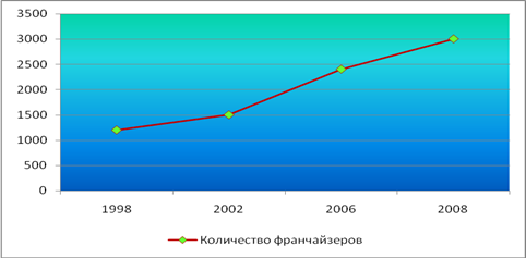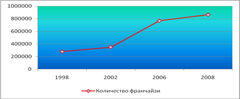 США являются мировым лидером в развитии системы франчайзинга. В 1998 г. в Америке насчитывалось около 1 200 франчайзеров; в 2002 г. действовало уже примерно 1 500 франчайзеров и 350 000 франчайзи; в 2006 г. имелось около 2 400 франчайзеров и 767 000 франчайзи. В 2008 г. в США насчитывалось примерно 3000 франчайзеров и 865 000 франчайзинговых точек, в которых задействовано 10 000 000 человек (см. рис. 2.1, 2.2) [62].