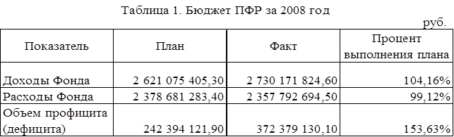 В данной главе рассматривается бюджет ПФР за период с 2008 по 2010 г. г. Данные представлены в виде таблиц, в которых указано количество средств в данном периоде по плану, фактические данные, а также процент выполнения планового задания.