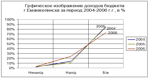 По данным анализа бюджета г.Еманжелинска за период 2004 – 2006 г.г. можно сделать общий вывод. Как видно из выше рассмотренного, на первом месте в течение трех лет находятся безвозмездные поступления: 2004 г. – 83,5%, 2005 г. – 86,3%, 2006 г. – 73,2% от общего объема доходов, но мы также видим, что хотя в 2006 г. доходы бюджета уменьшились, увеличились налоговые доходы на 12,5% по сравнению с 2005 г. Это связано в большей степени с увеличением поступлений в бюджет налога на доходы физических лиц (с 5,8% 2005 года до 17,8% 2006 года).