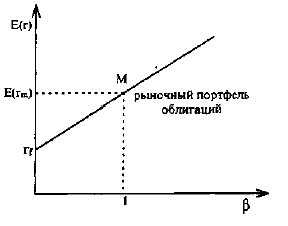 Формула (***) говорит: если доходность рыночного портфеля облигаций вырастет на 1%, то доходность i-й облигации возрастет на величину β . На рис. 10 представлена линия рынка облигаций. Как следует из формулы, в данной версии САРМ доходность облигации является линейной функцией дюрации облигации.