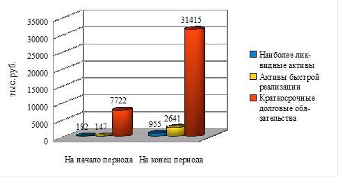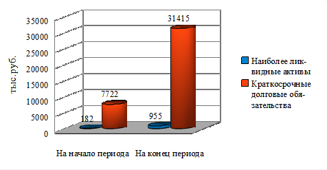 На рисунке 2.10 показано, что дефицит наиболее ликвидных активов для погашения краткосрочных обязательств составил 7 540 тыс. руб. (7 722 тыс. руб. - 182 тыс. руб.) на начало года и 30 460 тыс. руб. (31 415 тыс. руб. - 955 тыс. руб.) на конец отчетного периода.