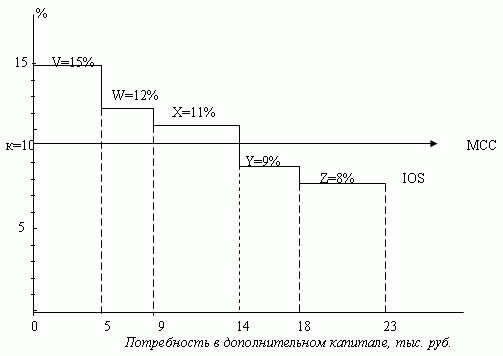 В случае формирования бюджета капиталовложений предельный доход понимается как доходность по проектам с учетом риска, а предельные затраты – как предельная цена капитала фирмы (см. рис. 3.).