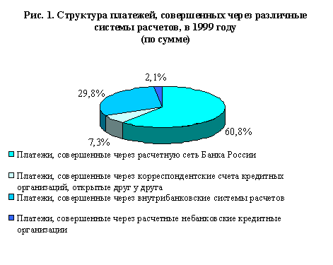 Соотношение объемов платежей, проведенных через различные системы расчетов, в 1999 году, приведено на рис. 1.