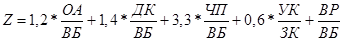 13. Показатель вероятности банкротства Е. Альтмана (Z-показатель). Применяется для анализа вероятности угрозы возможного банкротства (утраты платежеспособности). Z-показатель Альтмана позволяет разделить хозяйствующих субъектов на нормально функционирующих и потенциальных банкротов. Итоговый коэффициент вероятности банкротства Z — рассчитывается при помощи пяти показателей, каждый из которых наделен определенным весом. [4]