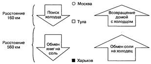 Таким образом, реализация сделки, связанной с поиском информации для покупки холодца, и осуществление посреднических обменов требовали покрыть расстояние приблизительно в 1500 км. В годы Гражданской войны при бесплатном проезде и благоприятном стечении обстоятельств это могло занять «всего-то» менее недели.