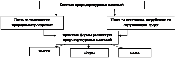 Итак, экологическим налогом (платежом, сбором) можно назвать налог (платеж, сбор), базой налогообложения которого является физическая единица, если в процессе ее производства осуществляется негативное воздействие на окружающую природную среду. Причем указанные налоги (сборы, платежи) направлены на уменьшение использования ресурсов и загрязнения окружающей среды. Систему природоресурсных платежей в нашей стране представим на рисунке. (Рис.1)