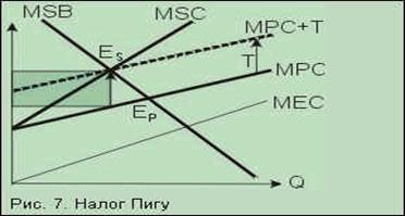 Итак, налог Пигу - это корректирующий налог на выпуск продукции, который применяется при отрицательных внешних эффектах и поднимает предельные частные затраты до уровня общественных.