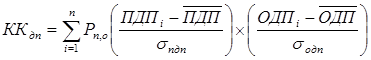 где ККдп – коэффициент корреляции положительного и отрицательного денежных потоков во времени, Рп,о – прогнозируемые вероятности отклонения денежных потоков от их среднего значения в плановом периоде, ПДПi – варианты сумм положительного денежного потока в отдельных интервалах планового периода,