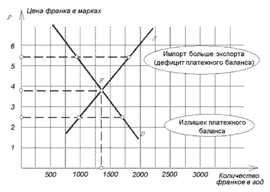 При более низком курсе валюты (например, 2,5 марки за франк) ставший более выгодным экспорт превысил бы ставший менее выгодным импорт и на рынке возник дефицит франков. Многие фирмы хотели бы купить дополнительное количество франков для оплаты экспорта, но недостаток предложения был бы причиной снижения цены франка до равновесного значения 1,2 марки.
