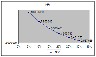 Из графика видно, что чистый дисконтированный доход убывает достаточно медленно с увеличением ставки сравнения, следовательно, проект эффективен.