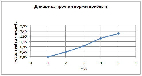 Динамику простой нормы прибыли показывается, графически для этого по оси ординат откладывают значение нормы прибыли, а по оси абсцисс – период функционирования проекта.