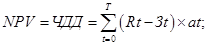 Чистый дисконтный доход (NPV) определяется как сумма текучих эффектов за весь расчетный период, приведенная к начальному периоду, расчеты выполняются в базовых ценах, для постоянной нормы дисконта по формуле:
