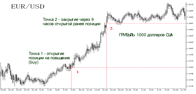 В 17:30 часов курс евро достигает уровня указанного в точке 2 и принимается решение закрыть позицию, а именно продать 100 000 евро по новому курсу. Так за время с 08:30 до 17:30 доход составил 1 000 долларов США.