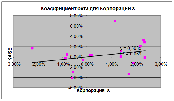 Вычисление дополнительного коэффициента, коэффициента корреляции R2, покажет, насколько изменение индекса движет цену акции. В данном примере, акция Корпорации Х очень слабо зависит от индекса KASE, т.к. коэффициент корреляции равен 0,069.