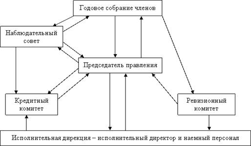 Органами кредитного кооператива являются общее собрание членов кредитного кооператива, правление кредитного кооператива, председатель кооператива или наблюдательный совет. В качестве исполнительного органа в кооперативе может быть создана исполнительная дирекция, а консультационно-совещательного – кредитный комитет.