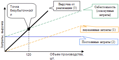 Прямые показывают зависимость переменных и постоянных затрат, а также выручки от объема производства. Точка критического объема производства показывает объем производства, при котором выручка от реализации равна ее полной себестоимости. После определения точки безубыточности планирование прибыли строится на основе эффекта операционного (производственного) рычага, то есть того запаса финансовой прочности, при котором предприятие может позволить себе снизить объем реализации, не приводя к убыточности. В точке безубыточности получаемая предприятием выручка равна его совокупным затратам, при этом прибыль равна нулю. Выручка, соответствующая точке безубыточности, называется пороговой выручкой. Объем производств (продаж) в точке безубыточности называется пороговым объемом производства (продаж). Если предприятие продает продукции меньше порогового объема продаж, то оно терпит убытки, если больше — получает прибыль. Зная порог рентабельности можно рассчитать критический объем производства: