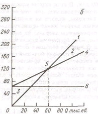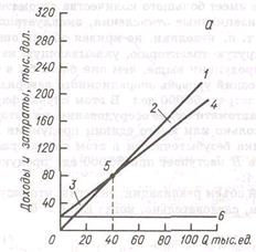 1 — выручка от реализации; 2 — операционная прибыль;3 — операционные убытки; 4 — общие затраты; 5 — точка безубыточности; 6 — постоянные затраты.