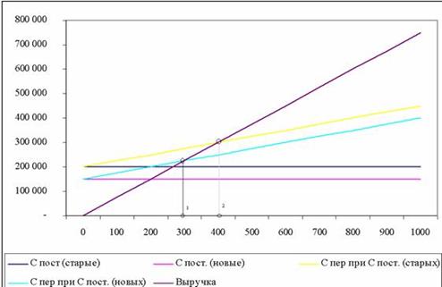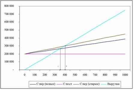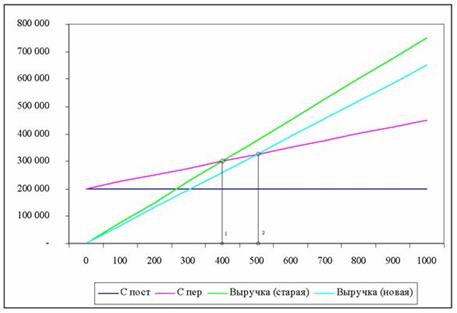 1 – новый минимальный объем безубыточности2 – старый минимальный объем безубыточности Уменьшение постоянных затрат на 25% с 200 т.р. до 150 т.р. привело к смещению точки безубыточности в лево на 100 шт. или на 25% с 400 шт. до 300 шт. Как видно из рисунка снижение постоянных затрат – это прямой и эффективный способ уменьшить минимальный безубыточный объем, чтобы повысить прибыльность фирмы.Изменение переменных затратУменьшение прямых переменных затрат на производство приводит к увеличению контрибуции, которую приносит каждая дополнительная единица, что в свою очередь влияет на увеличение прибыли, а так же к смещению точки безубыточности.Уменьшение прямых переменных затрат может быть достигнуто с помощью перехода на новые более современные материалы производства или с помощью переориентации на поставщика, который предлагает менее дорогие комплектующие.