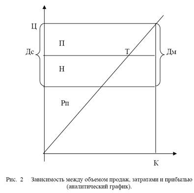 График позволяет сразу ответить на вопросы, при каком объеме продаж предприятие получит прибыль и при каком объеме продаж ее не будет. Точка, при которой за траты на производство и сбыт продукции будут равны выручке от продаж, называется точкой критического объема продаж. Если пакет заказов на продукцию будет ниже объема в критической точке, для фирмы может быть решен вопрос о целесообразности организации выпуска продукции в объеме, определяемом пакетом заказов покупателей. График показывает, что на прибыль прямое влияние оказывает объем продаж и себестоимость, в той ее части, которая относится к постоянным расходам. Связь прибыли с объемом продаж зависит не только от количества проданного, но и от той доли постоянных расходов, которая будет отнесена на единицу проданной продукции. Этому фактору уделяется большое внимание. И поэтому тщательно изучают возможности снижения уровня общей суммы постоянных расходов. С этой целью выполняются предварительные расчеты. Известно, что рост объема производства и продаж неминуемо влечет за собой увеличение отдельных видов затрат, относимых к постоянным расходам. Поэтому при принятии решения о расширении производства для определенных его уровней составляются соответствующие им расчеты бюджетов постоянных расходов. Оптимальным признается бюджет, который позволяет снизить долю постоянных расходов в цене на единицу продукции. Обычно, вместо постоянного построения графиков проводится расчет точки критического объема продаж аналитическим путем. Для вывода формул аналитического расчета используют график, приведенный на рис. 2.