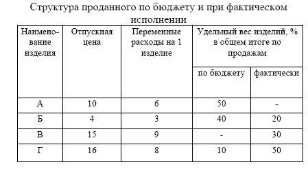 Известно, что выручка от продаж по бюджету определена в сумме 200 тыс. тенге., при фактическом исполнении 231,4 тыс. тенге. и постоянные расходы 50 тыс. ед. не менялись. При расчете выявляют влияние на прибыль изменения объема и структуры продаж. По формуле (7) П=В*Ду-Н. Сначала определяют Ду для каждого изделия, а затем определяют средний Ду для: