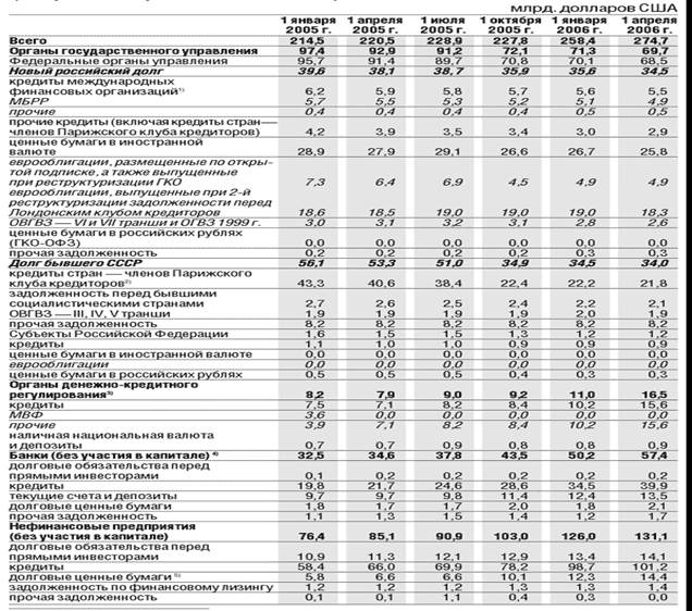 Внешний долг Российской Федерации (перед нерезидентами) увеличился в течение отчетного периода на 16,3 млрд. долларов и составил на 1 апреля 2006 года 274,7 млрд. долларов.